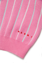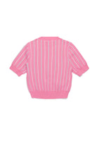 縦ストライプニットの半袖クルーネックトップス。裾にコントラストカラーでインスティテューショナルロゴの刺繍入り。クルーネック、袖口と裾にリブ編み。コットン100%製。