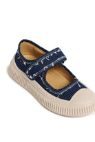 トップにストラップが付いたロータイプのMary Jane・トレーナーです。バックサイドにインスティテューショナルロゴがコントラストカラーでプリントされています。アッパーはコットン100%のダークデニム製。牛革(カーフレザー)インナー。熱可塑性ラバーソール。イタリア製。