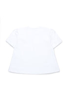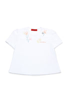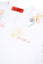 コットン100%のジャージー素材、バルーンスリーブのTシャツ。フロントに花柄の刺繍が施されたクルーネック。コントラストカラーのMAX&Co.ロゴがフロントのハート柄に刺繍されています。