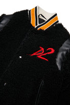 背中にベアの刺繍ワッペンが付いたテディ・ボマージャケット。ホラーの世界とカナダの原生林を皮肉ったディテール。