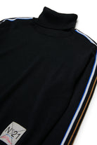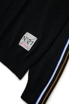 ウール混の削ぎ編みニットのモックネックで、袖にあしらわれたマルチカラーのバンドがアクセントになっています。裾にあしらわれたラベルN°21が個性的なタッチを加え、快適さとカジュアルスタイルの完璧なバランスを実現。