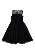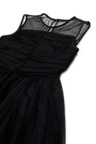裾にチュールをあしらった、特別な日にぴったりのデュシェス風ミディドレス。チュールがボトムにボリュームと動きを与え、ギャザーの入ったブスートが上品さを演出します。