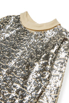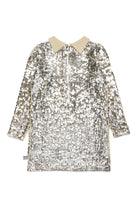 シルバーのスパンコールがあしらわれたウール混の削ぎ編みニットのミニドレス。1950年代の襟が魅力とオリジナリティを添える、レトロなテイストの一着。パーティーや特別な日に最適。