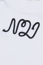 半袖のソフトなコットン・ジャージー製Tシャツ。胸にコントラストカラーのドローストリングであしらわれた筆記体のロゴ「N°21」が、シンプルながら個性的な一着です。