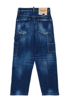フロントに大きなパッチポケットとコントラストステッチが施されたストレートジーンズ。