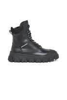 チャンキーソール、シューレース、ロゴ入りサイドラベルが付いたレザー製コンバットブーツ。実用性と個性がミックスされた、靴で個性を表現したい人にぴったり。