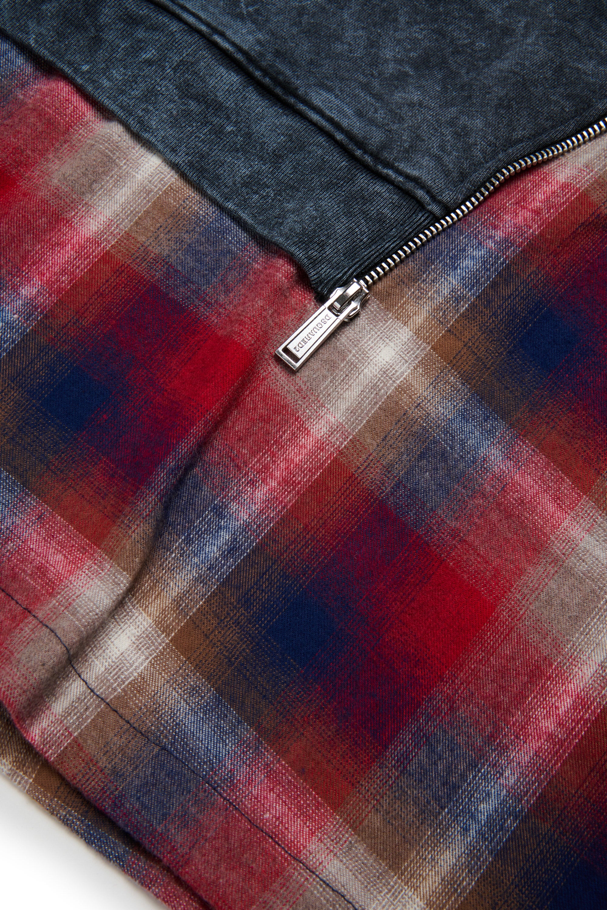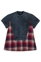 マーブル模様のマキシ・セーター・ドレスで、ボトムとバックはチェック柄のフランネル。コントラストを効かせた素材とフロントジッパーなどの美的ディテールが、反骨精神に満ちた都会的なルックを演出する独創的なデザイン。