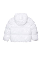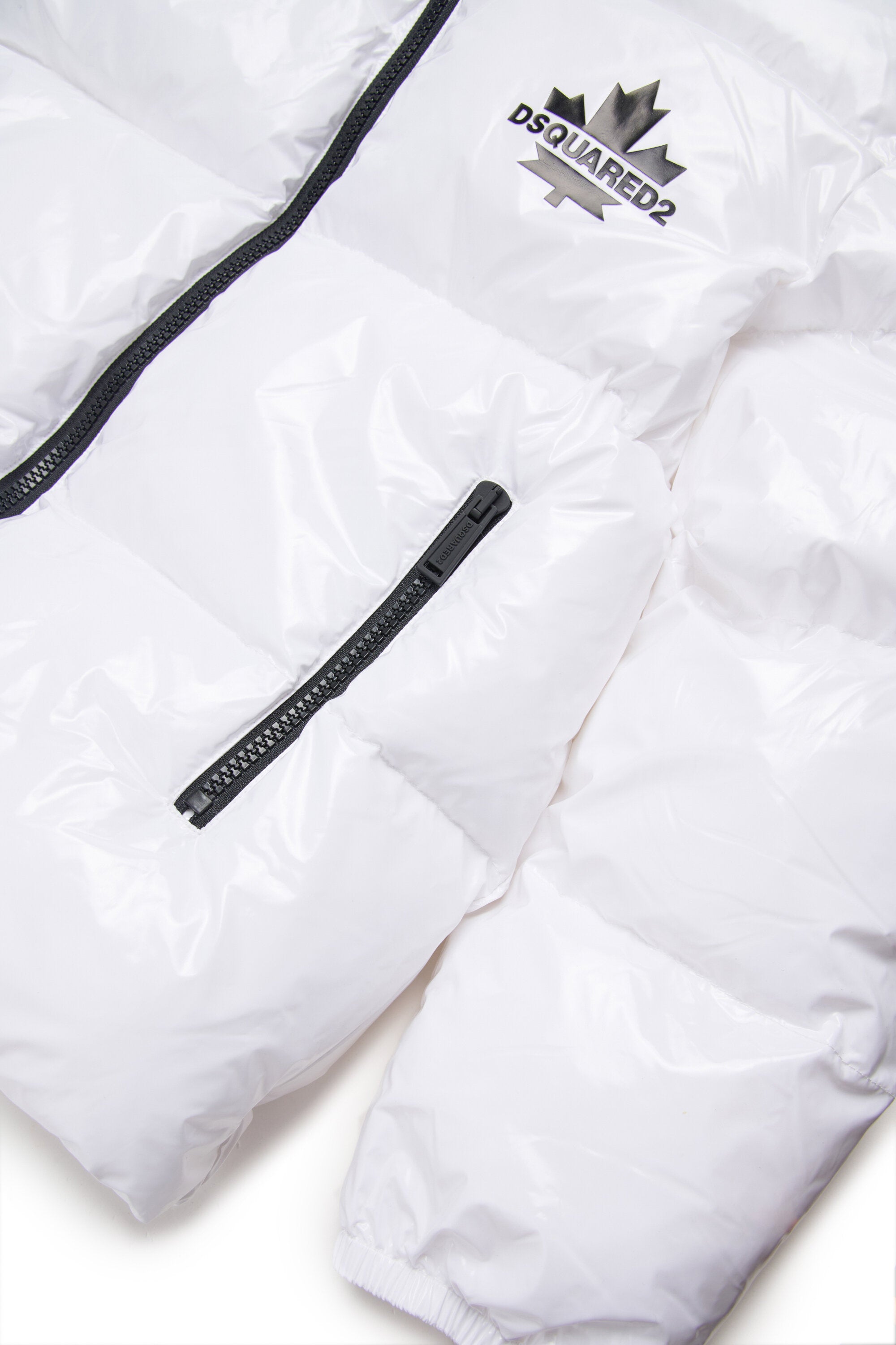 メープルリーフのロゴがエンボス加工された中わた入りのショートジャケット。光沢のある仕上げと現代的なデザインが、スタイルと機能を兼ね備えた一着として、寒い日を暖かく個性的に包み込む。