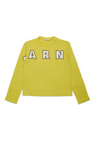 長袖クルーネックジャージーTシャツ。ややクロップド丈のフィット感で、ドロップショルダー。フロントにインスティテューショナルなロゴをあしらい、袖にはコントラストカラーの刺繍があしらわれています。綿100%で作られています。合わせやすいカジュアルなオプション。