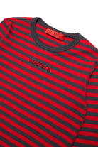 先染めコットン製のストライプ・マイクロリブの長袖Tシャツ。フロントにプリントされたラバー加工ロゴを引き立てるミックスカラー。