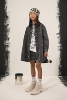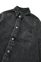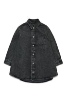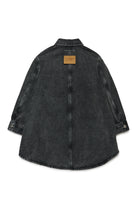 アシンメトリーなボトムが特徴の、着古したような風合いのブラックデニムマキシシャツドレス。着心地の良さとスタイルを兼ね備えた、どんなシーンにもマッチする万能のマストアイテム。