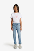 コントラストステッチとアイコニックなディテールが際立つライトデニムのスリムフィットジーンズ。汎用性を高めるシンプルなファイブポケットデザイン。