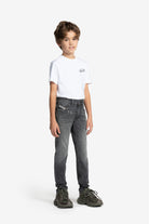 1995年、アイコニックなアティテュードを持つ、グレーの擦り切れたようなエフェクト・デニムのスリムフィットジーンズ。ストレートカットのスリムフィットモデル。どんなシチュエーションにも合う、デニム愛好家のためのジーンズ。