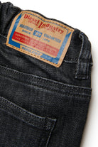 ブラックデニムのレギュラージーンズ、ワッペン付き、コントラストステッチ、背面にラベル付き。