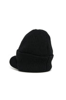 暖かく柔らかいウール混のニットビーニー。バイザーが個性と実用性を加え、フロントにあしらわれた赤いDパッチが個性を際立たせる。