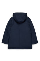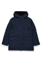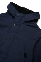 肩にディーゼルパッチが付いたナイロンパッド入りロングジャケット。フード付きのフェイクダウンパッド。隠しフロントジッパークロージャー、フロントに4つのポケット。