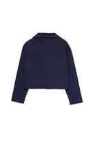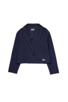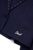 ロゴがプリントされたブレザー、ラペルにスタッズのディテール。モダンなデザインで、コーディネートに個性的なアクセントを加えます。