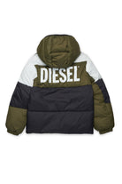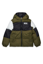 フード付きロゴ入り中綿ジャケット。カラーブロック柄と機能的なディテールにより、保温性と現代的なデザインを両立。固定フードと中綿構造が寒い日の保護性を高め、胸元のロゴが個性を引き立てます。