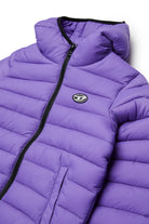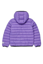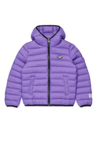 ロゴ入りプリントと固定フード付きの中綿ジャケット。キルティングデザインがコンテンポラリーなルックを引き立てます。