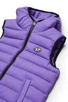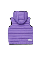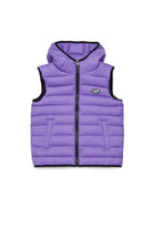 ロゴプリント入り中綿ジレ、ノースリーブデザインとフード付き。無駄のないラインで実用的な一着は、あらゆるコーディネートの仕上げに最適です。