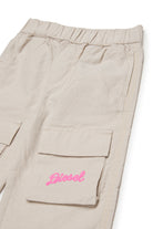 ロゴ入りカーゴポケット付きパンツ。ウエストにドローストリングが付いた実用的なモデルで、100%コットン製です。