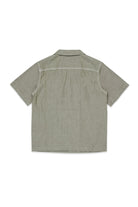 胸にロゴがあしらわれた半袖シャツで、ダブルフロントポケットと同色のボタンが特徴です。