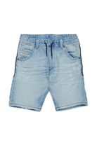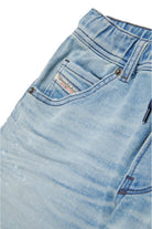 ドローストリングウエストのJoggJeans®ショートパンツ。コントラストカラーのグラデーションとひげが特徴的な、ソフトハンドルのライトブルーデニム製。フロントはジグザグに折り返したリペア加工。サイドにカラーコントラストステッチ。