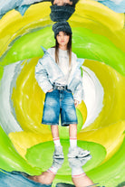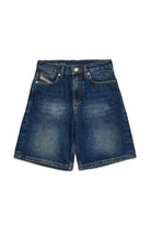 小さな擦り傷が入ったダーティーエフェクトのダークブルーデニムショートパンツ。ワイドフィットモデルで、ストリートスタイルのテイストを取り入れた快適な履き心地がお好みの方に最適です。