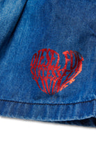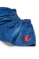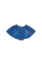 ウエストにドローストリング付きのデニムショーツ、ロゴプリント入り、ゆったりとしたフレアシルエット。