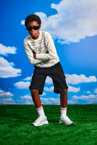 ジャージー素材のショートパンツ。クリーンな印象のブラックデニム製で、シームとポケットに施された小さな擦り傷が特徴です。脚に沿ってカーゴスタイルのパッチポケットが付いています。