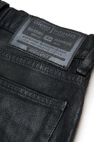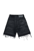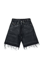 裾を生デニムでカットしたブラックデニムのショートパンツ。特殊コーティングによる光沢が、グランジ・ソウルをより一層引き立てている。