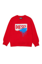 プリントロゴがペイントが垂れたようなデザインのクルーネックスウェット。