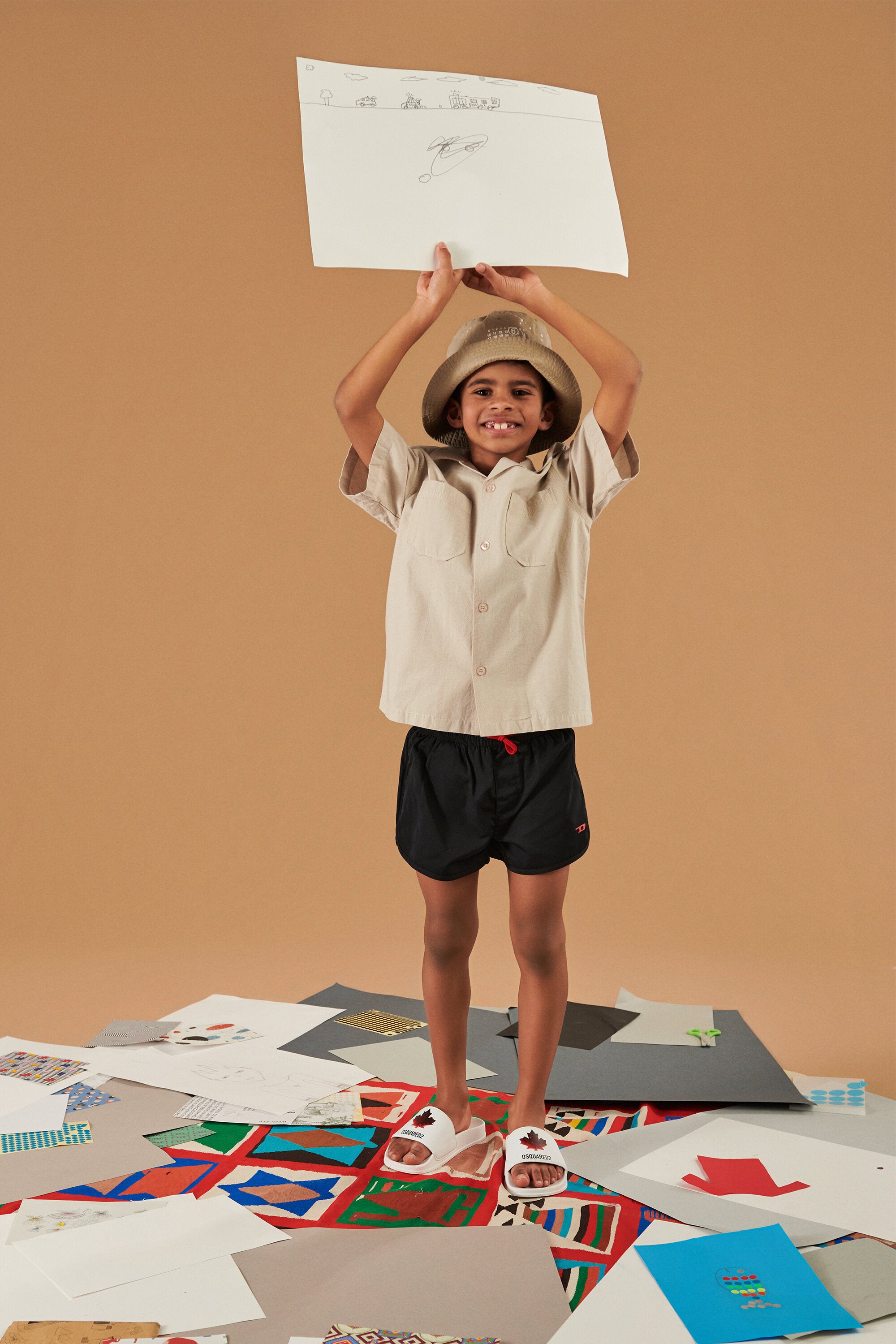 サイドにロゴ入り、バックにパッチポケットを備えたボクサースタイルのスイムウェア。ビーチでの一日に最適な実用的なアイテムです。
