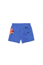 ナイロン製ボクサー水着。ウエストゴム部分。サイドに消防車のグラフィック。メッシュインナーブリーフ。フロントウェルトポケットとバックポケット。