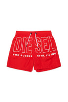 ロゴ入りボクサースタイル水着、フロントに大胆なコントラストプリント