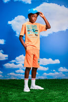 クルーネック半袖ジャージー素材スウェットシャツ。オーバーサイズ。顔料でガーメントダイ(製品染め)し、手作業でスプレー加工を施し、霜降り効果をカスタマイズ。フロントにDiesel Industryのポップアップグラフィック。コットン100%製。