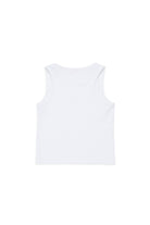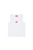 胸にロゴが入った、シンプルなデザインのノースリーブTシャツ。ストレッチコットン素材使用。