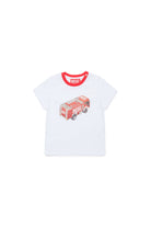 ジャージー素材の半袖クルーネックTシャツ。フロントに消防車のグラフィック。クルーネックにコントラストカラーのリブ編み。肩に実用的なボタン留め。コットン100%製。