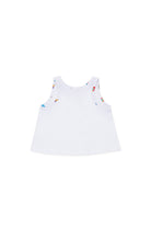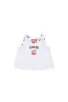 ロゴとカラフルなディテールが特徴のTシャツ。100%コットン製で、ノースリーブのカットが際立ちます。