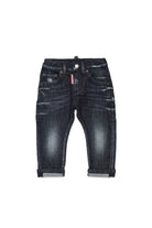 5ポケットジーンズ。グラデーションと色のコントラストが特徴のブラックデニム製。折り返しの裾はインサイドアウト仕様。フラップにDsquared2のロゴ入り。