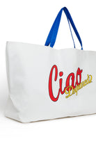 ロゴ入り、コントラストカラーのハンドルが特徴の、広く実用的なデザインのバッグ。