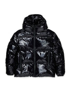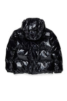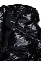 メープルリーフのロゴがエンボス加工された中わた入りのショートジャケット。光沢のある仕上げと現代的なデザインが、スタイルと機能を兼ね備えた一着として、寒い日を暖かく個性的に包み込む。