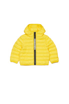 ロゴがプリントされた水平キルティングデザインの中綿入りジャケット、固定フード付き。