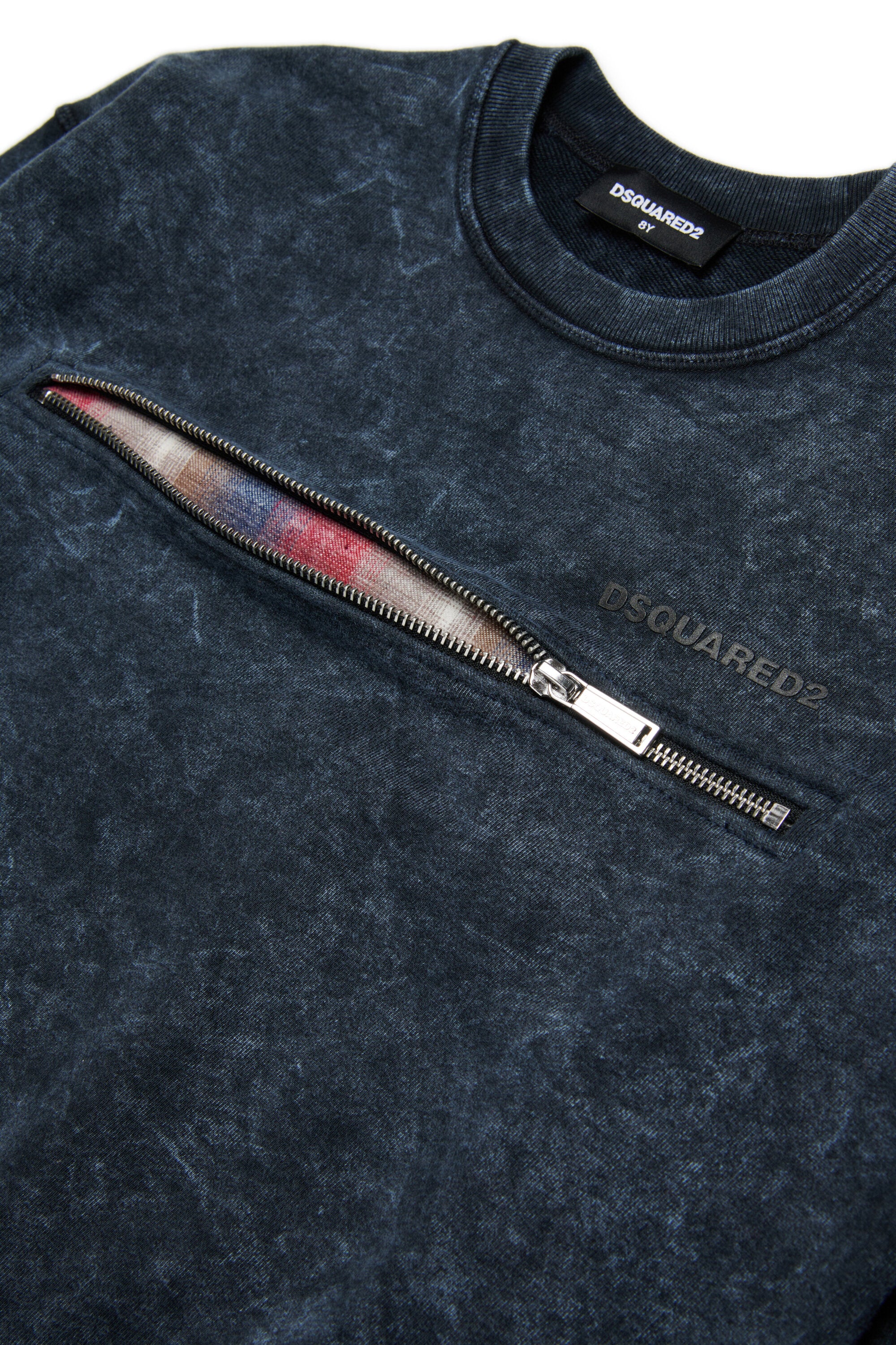 長袖の霜降り風クルーネックスウェットシャツ。チェックチェックのフランネル素材を内側に使用したフロントポケットが、グランジの美学と機能性の間にスタイリッシュなアクセントを加えます。