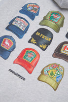 ジップ付きフード付きスウェット。ロゴはフロントにあり、背面にはキャップをテーマにしたプリントが施されています。