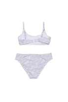 DSQ2ロゴプリント入りビキニ、細いストラップ、総柄プリント、コントラストの効いたディテール。