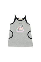ロゴ付きショートドレス。ノースリーブデザインで、フロントに木馬プリントとコントラストの効いた縁取りが特徴です。