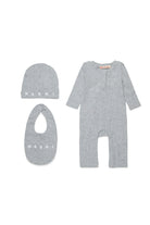お揃いのボディスーツ、ビーニー、ビブが付いたマイクロコスティーンのソフトニット製バースセット。キットはオリジナルのギフトボックスに入っています。