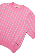 縦ストライプニットの半袖クルーネックトップス。裾にコントラストカラーでインスティテューショナルロゴの刺繍入り。クルーネック、袖口と裾にリブ編み。コットン100%製。