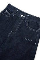 ロゴ入りデニムショートパンツ、コントラストステッチ、クラシックなファイブポケットディテール。